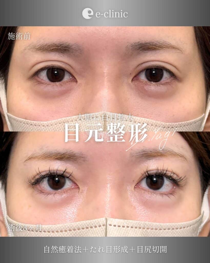 タレ目形成では変化量を増やすとカクツキが生じがちですが、内部の固定点を増やすことでなだらかなカーブを描くよう微調整しました。まぶたの硬さ、表情筋の使い方を診察して3か月後の完成を想定して直後はオーバーに拡大しています。
